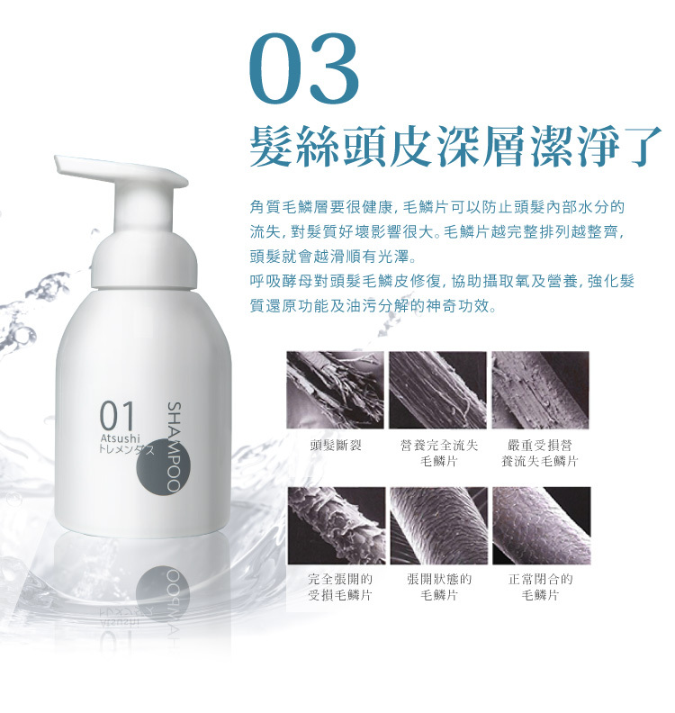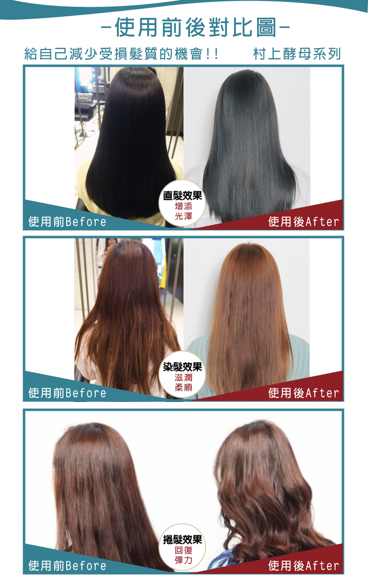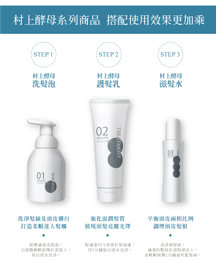 村上酵母由村上先生與日本東京農業大學合作開發!找出呼吸酵母中的珍貴成分,維生素H及多重營養配方對於髮絲頭皮有極大的幫助。整套系列為日式專業髮型沙龍使用商品,完整三步驟打造完美髮質。洗髮泡適用於任何髮質,胺基酸配方泡沫柔細,不造成髮絲磨損,即使柔嫩頭皮也能放心使用。獨家研發呼吸酵母可修復來自燙髮及染髮的損傷,咖啡因有助於秀髮的健康代謝及賦活,海鹽改善頭皮油脂,避免頭髮厚重,幫助盈潤豐髮,活順髮絲。 |