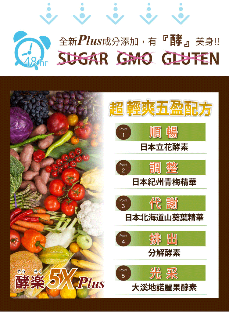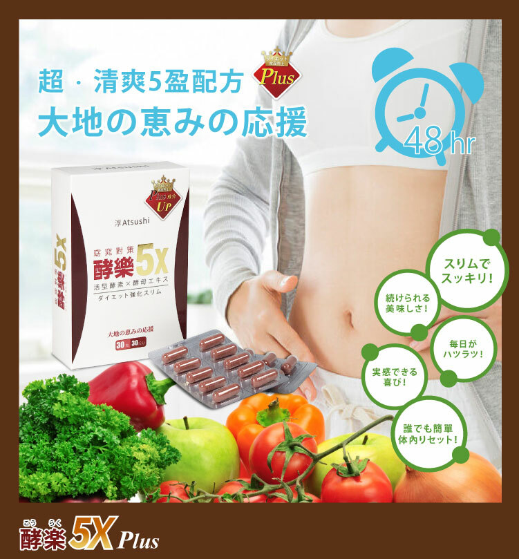 | 產品特色 | 窈窕對策 酵樂5X Plus加強版,日本新一代黃金5X系統輕盈再升級!全新PLUS成分添加,有『酵』加強美身美肌!補足人體五大困擾所誕生的酵素補充品,輕鬆緩解負擔沉重的身體壓力,一天一顆,輕鬆打造輕盈爽快的生活! |