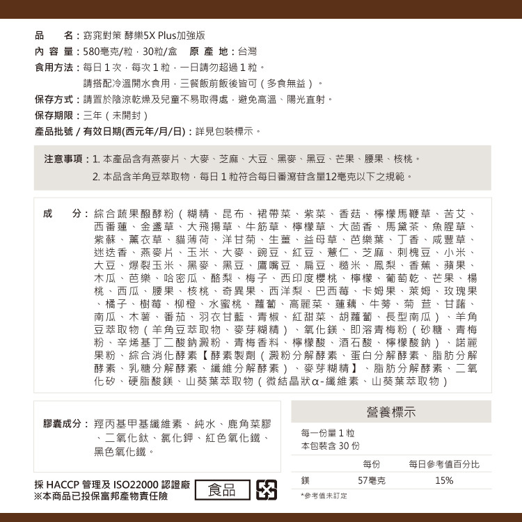 品牌:淳 Atsushi 品名:窈窕對策 酵樂5X Plus加強版 容量:540毫克/顆,30顆/盒 |