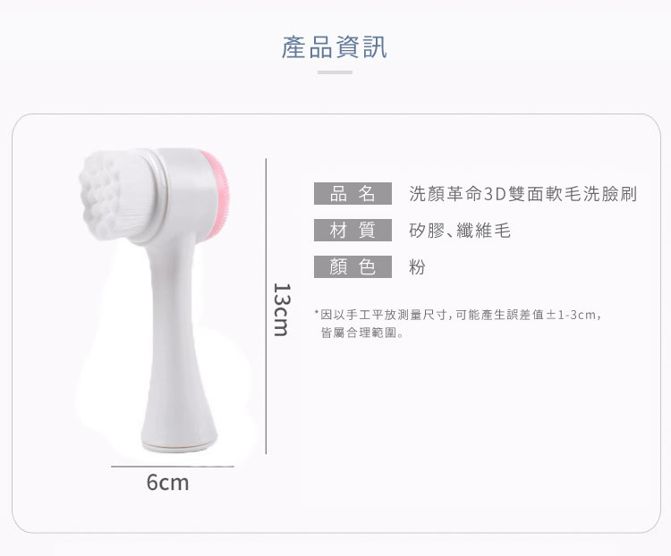 | 產品規格 | 品牌:住友良品 品名:洗顏革命3D雙面軟毛洗臉刷 顏色:粉 成分:矽膠、纖維毛 尺寸:長13cm 高5.5cm 寬4cm ※ 因以手工平放測量尺寸,可能產生誤差值±1-3cm,皆屬合理範圍。 |