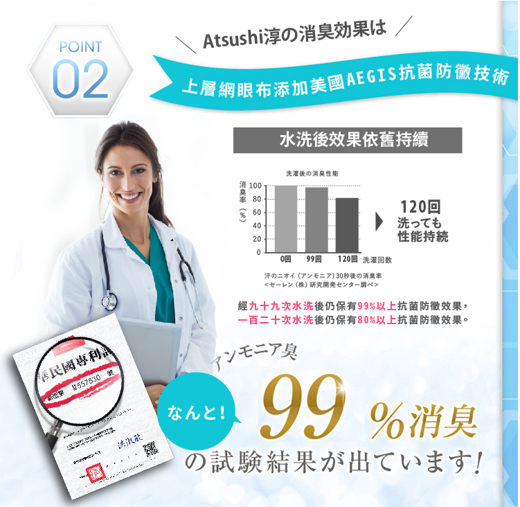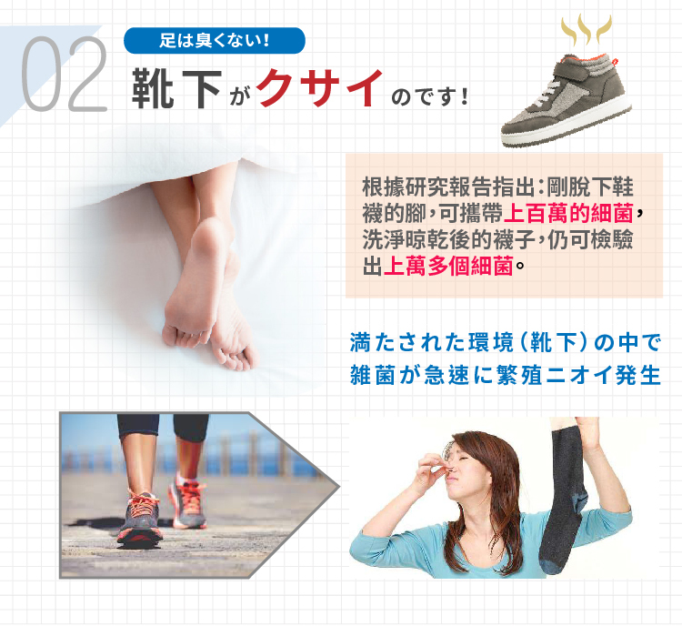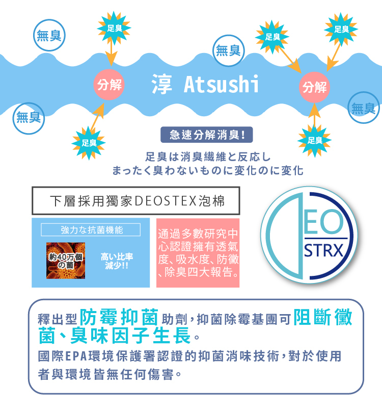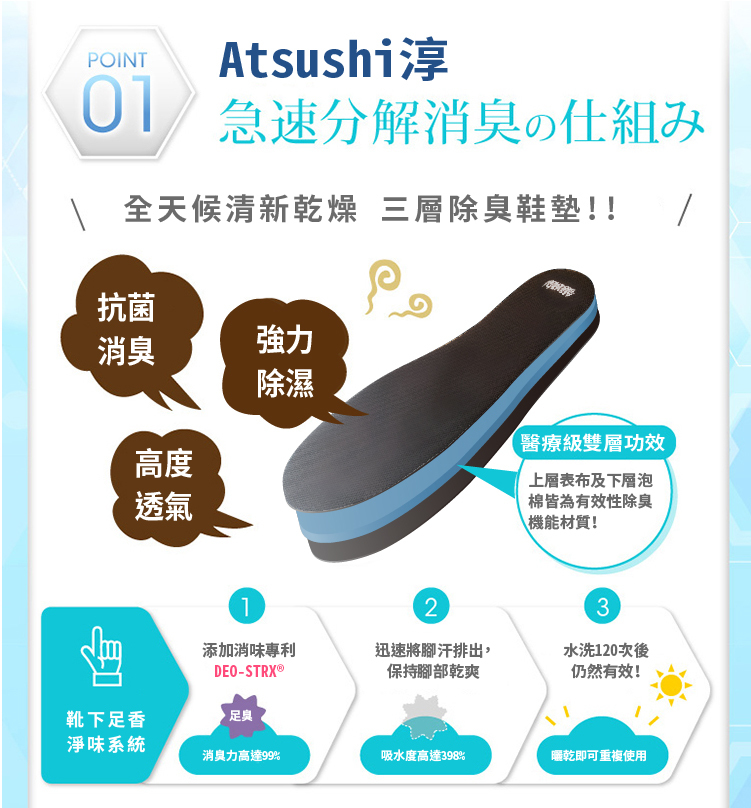1. 消味專利DEO-STRX®:醫療級雙層功效靴下足香淨味系統