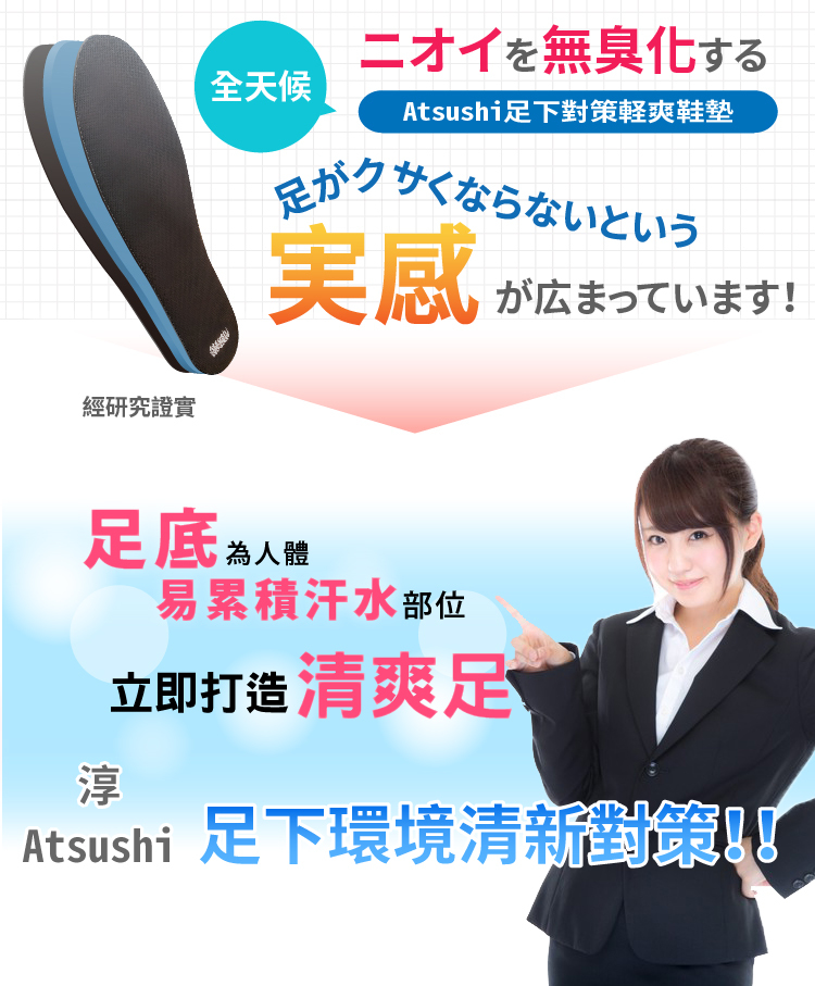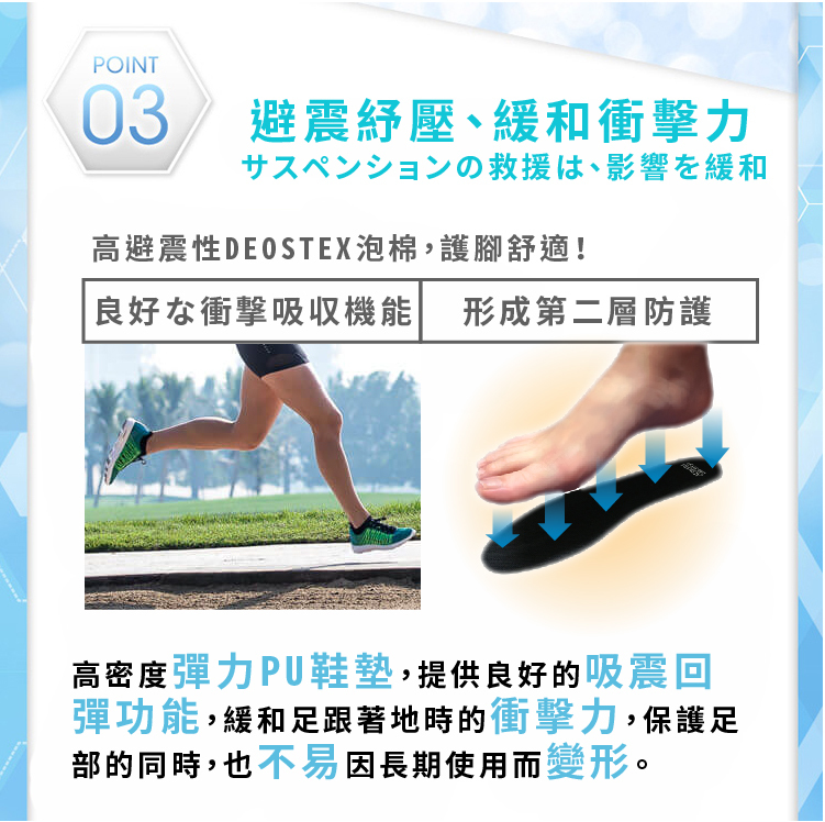 | 產品特色 | 採用醫療級雙層靴下香足淨味系統,上層添加消味專利助劑立體網眼布,高度透氣+強力除溼 ,可快速吸汗,維持鞋墊表面乾爽不黏膩。下層添加消味專利助劑Q彈PU墊,減壓耐震+消臭去味,讓效果加倍,並提供足部最好的保護緩衝壓力。 |