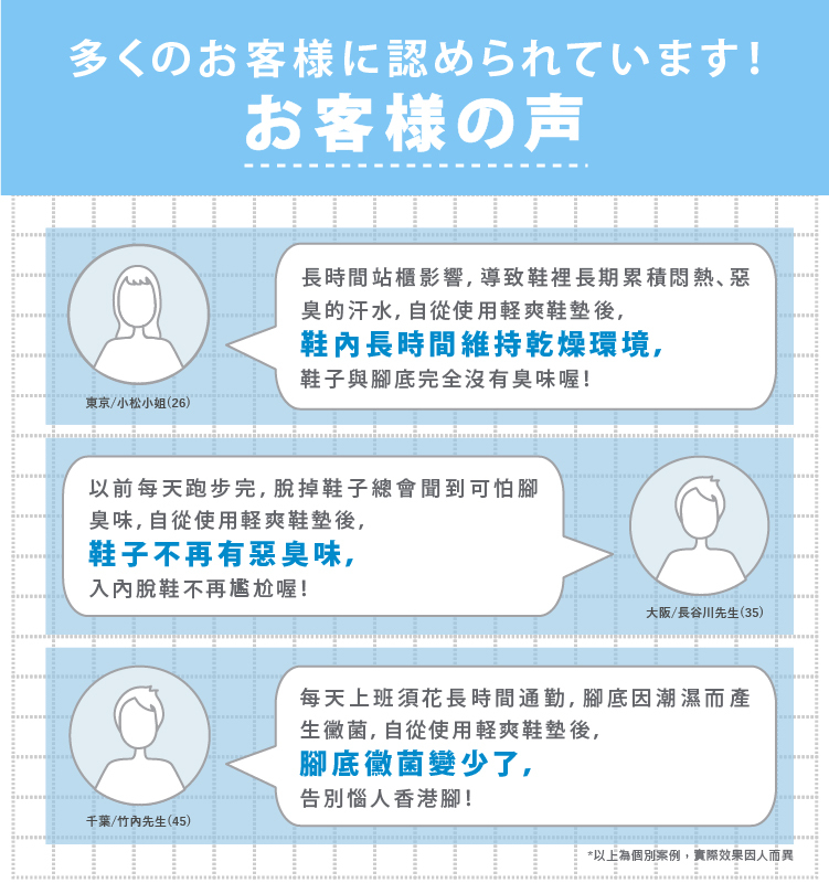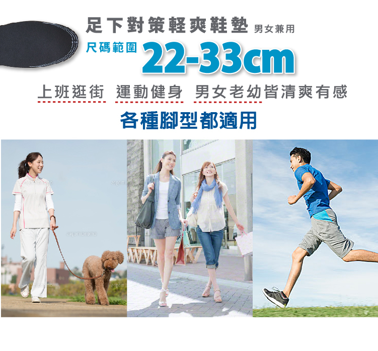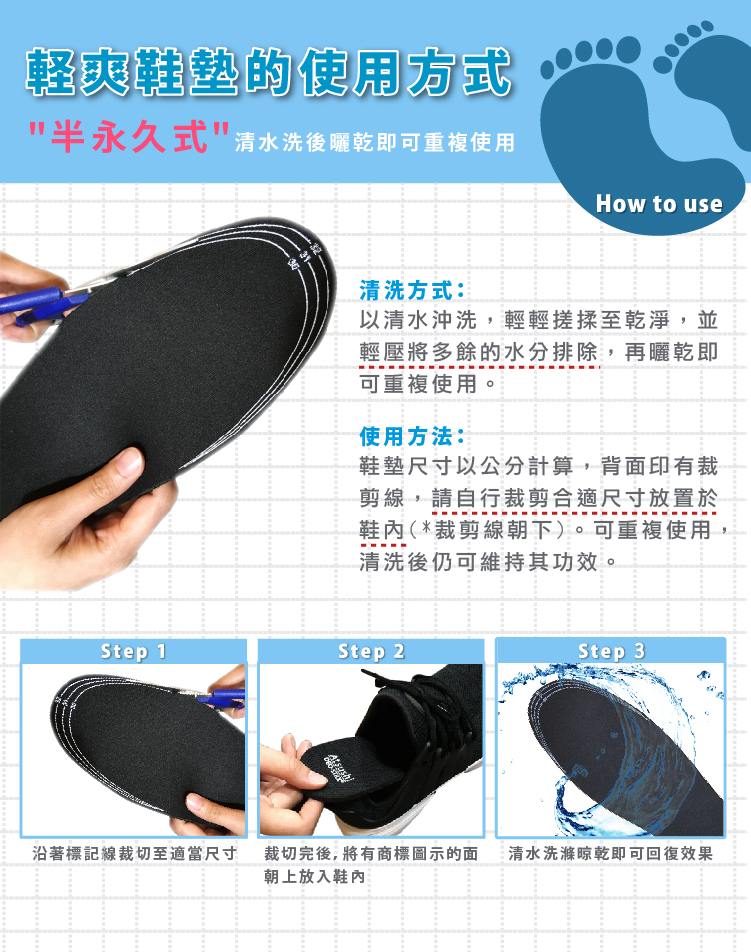 | 使用方式 | 鞋墊尺寸以公分計算,背面印有裁剪線,請自行裁剪合適尺寸放置於鞋內(*裁剪線朝下)。可重複使用,清洗後仍可維持其功效。 |