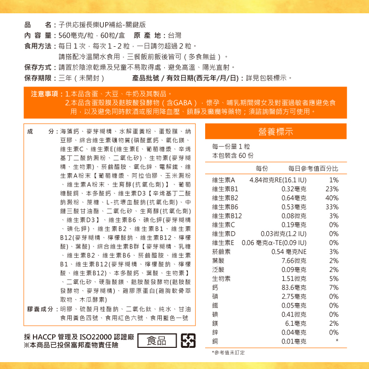 | 產品特色 | 日歐專利雙鈣【日本專利卵殼鈣X愛爾蘭海藻鈣】,打造成長地基!成長關鍵補給交給【長樂UP】!日系E5黃金配方,高効成長更給力,孩子贏在起跑點,成長一等應援啦啦隊! |