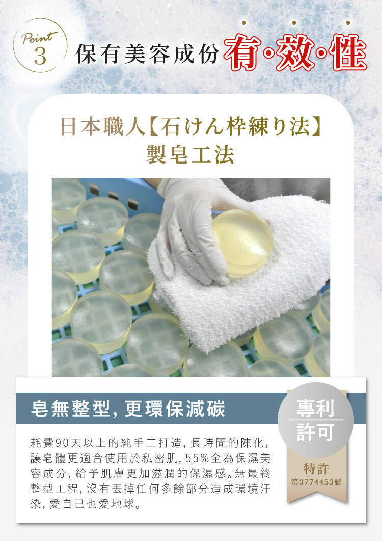 4. 日本專利職人【石鹼枠練り法】55%保濕美容成分,皂無整型,更環保減碳