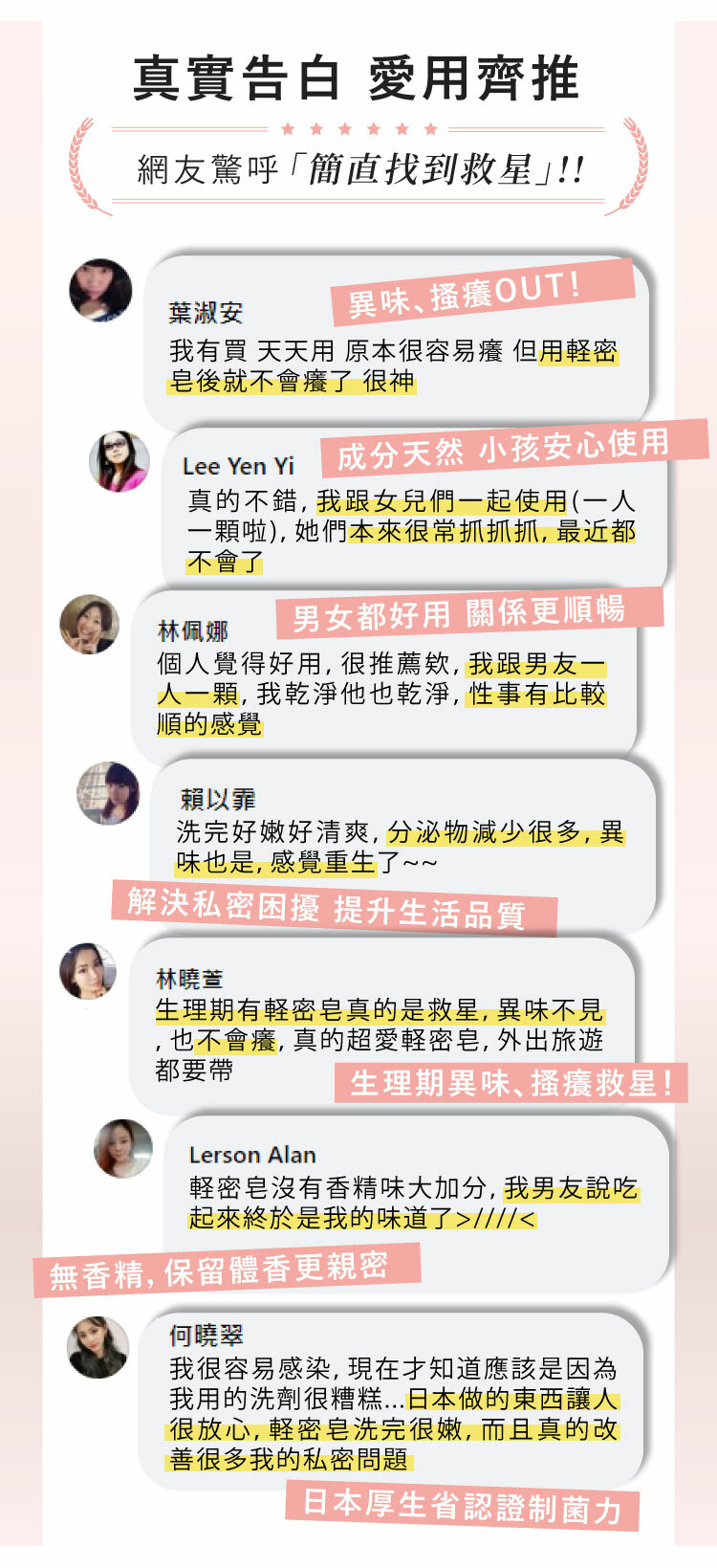 | 產品特色 | 日本私密保養新觀念,呵護自己,關係更升級!日本3大獨家密技潔淨同時保養,嫩白、緊緻、抗老、長效清爽無異味,無添加不敏感,高制菌力讓每天都舒適。 |