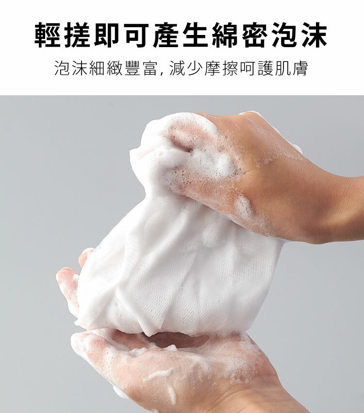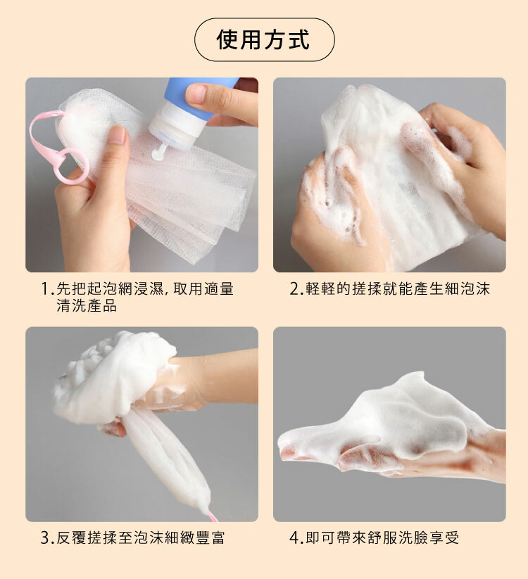 | 使用方式 | 先把起泡網浸濕,取用適量清洗產品,軽軽的搓揉就能產生細泡沫,即可帶來舒服洗臉享受。 |